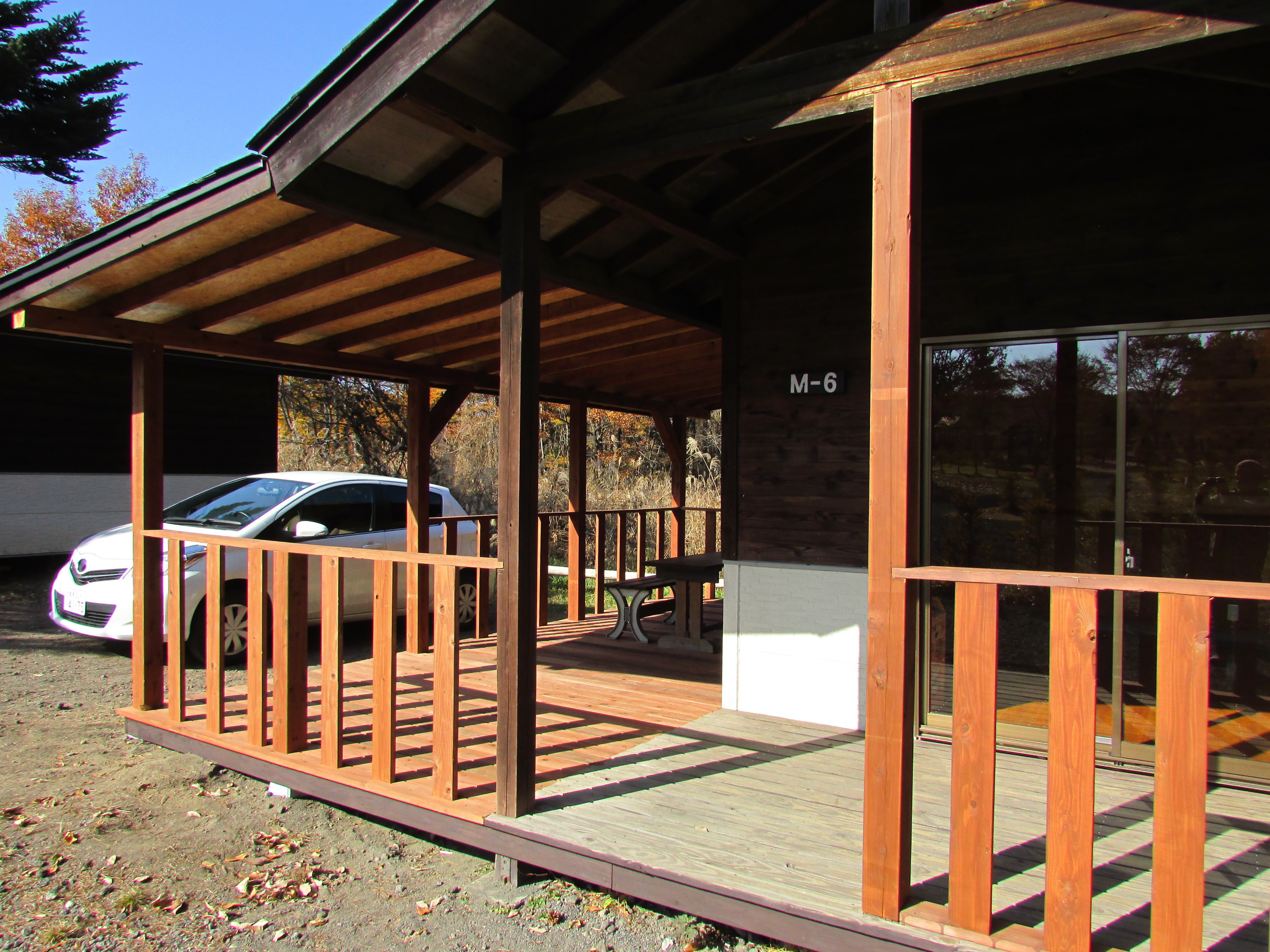 バンガローのすぐ横に駐車できます。 |